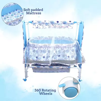 - Made from premium quality metal which is sturdy and long-lasting, Can be used from birth up to 3yrs, Has a swinging function that baby can enjoy, The cot has four wheels that make it easy to shift and use in different rooms, Has a mosquito net that shields the baby from insects and allows them to sleep peacefully